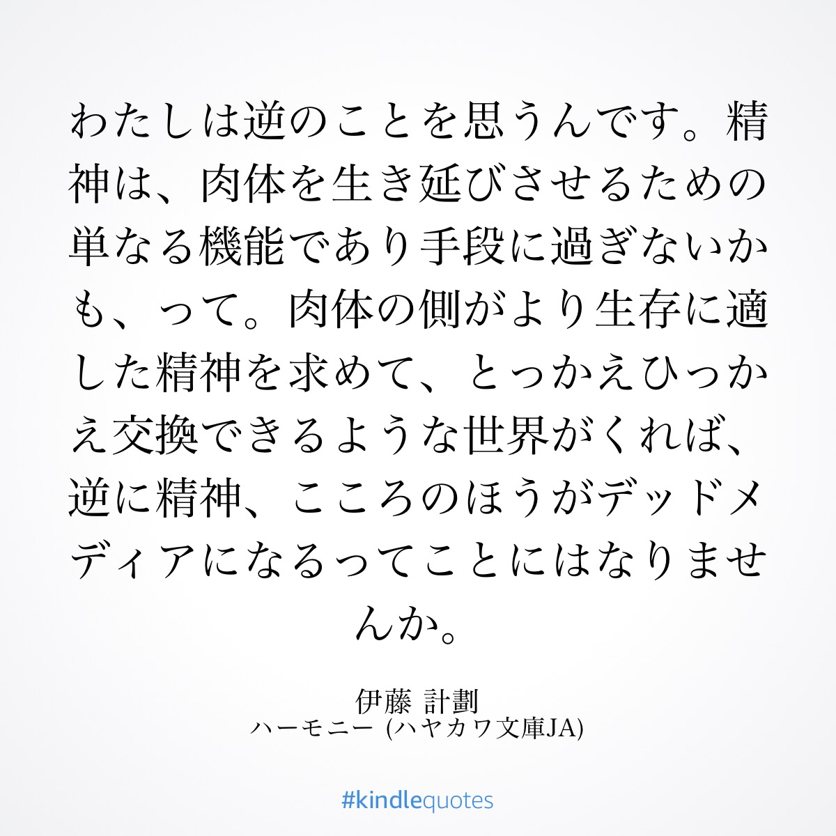 うーん、『虐殺器官』よりは分かりやすかったけど本として特に好きではない。私が伊藤計劃を読もうとしたキッカケは「伊藤計劃は人間には意識がなくても身体だけで生きていけるって話をしている」というポストを見たからだけど、その題材的にはハーモニーは分かりやすかった。テーマとしても好きだ。生物が生きる意味が種の保存や子孫繁栄だった場合、重要なのは身体であり意識ではないのでは?という話。確かにSFでは意識ばかりが重要視されてきたイメージ…というより『攻殻機動隊』の影響がかなり大きい気がしているが…。つまり「ゴースト」の話だけど…。