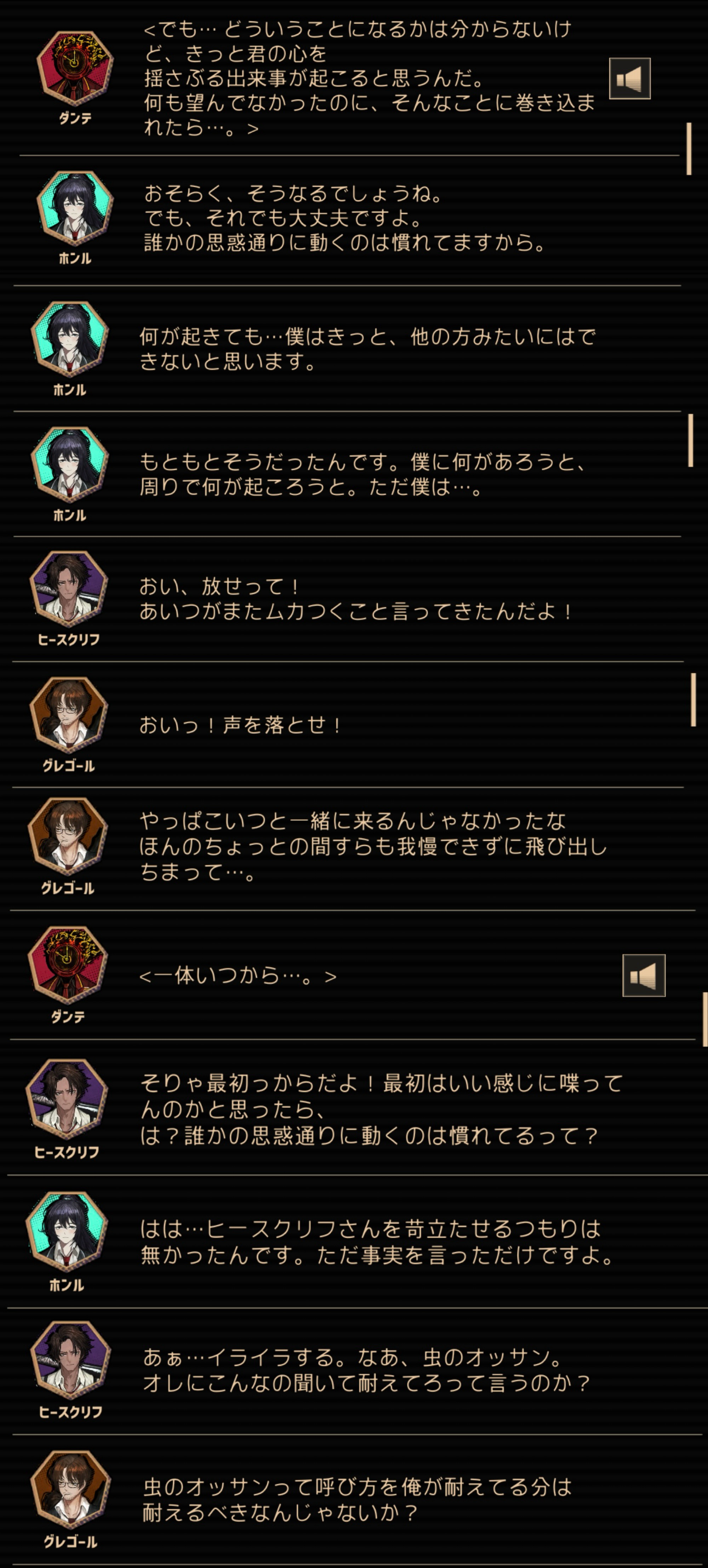 今後のバス組、ドンキに対してややビビりの対応せん?俺は普通にビビっている。そして全てを知りつつ指導してたヴェルギリウスすごいわね。ヴェルギリウスは血鬼なのかな…?文章から確定まで読み取れなかったような…?