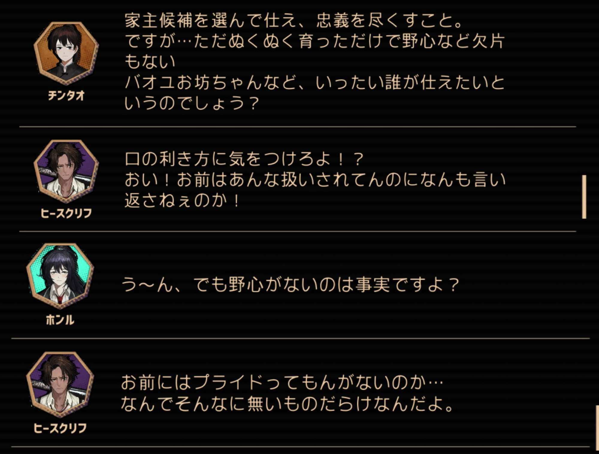 無気力ホンルにつっかかるヒースクリフに毎度萌えてるんだが、ヒースクリフは何も持ってないのにプライドだけはある男なんだな!と思うと萌えすぎる。